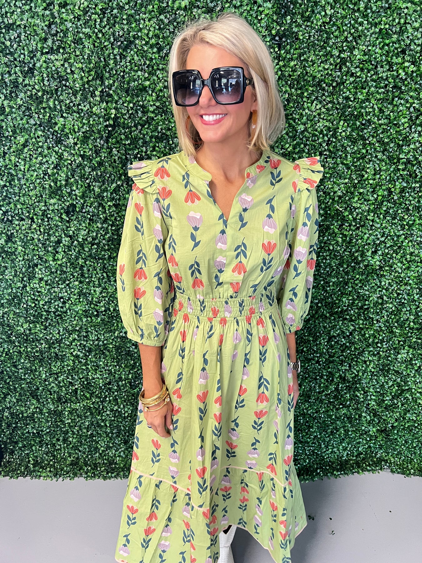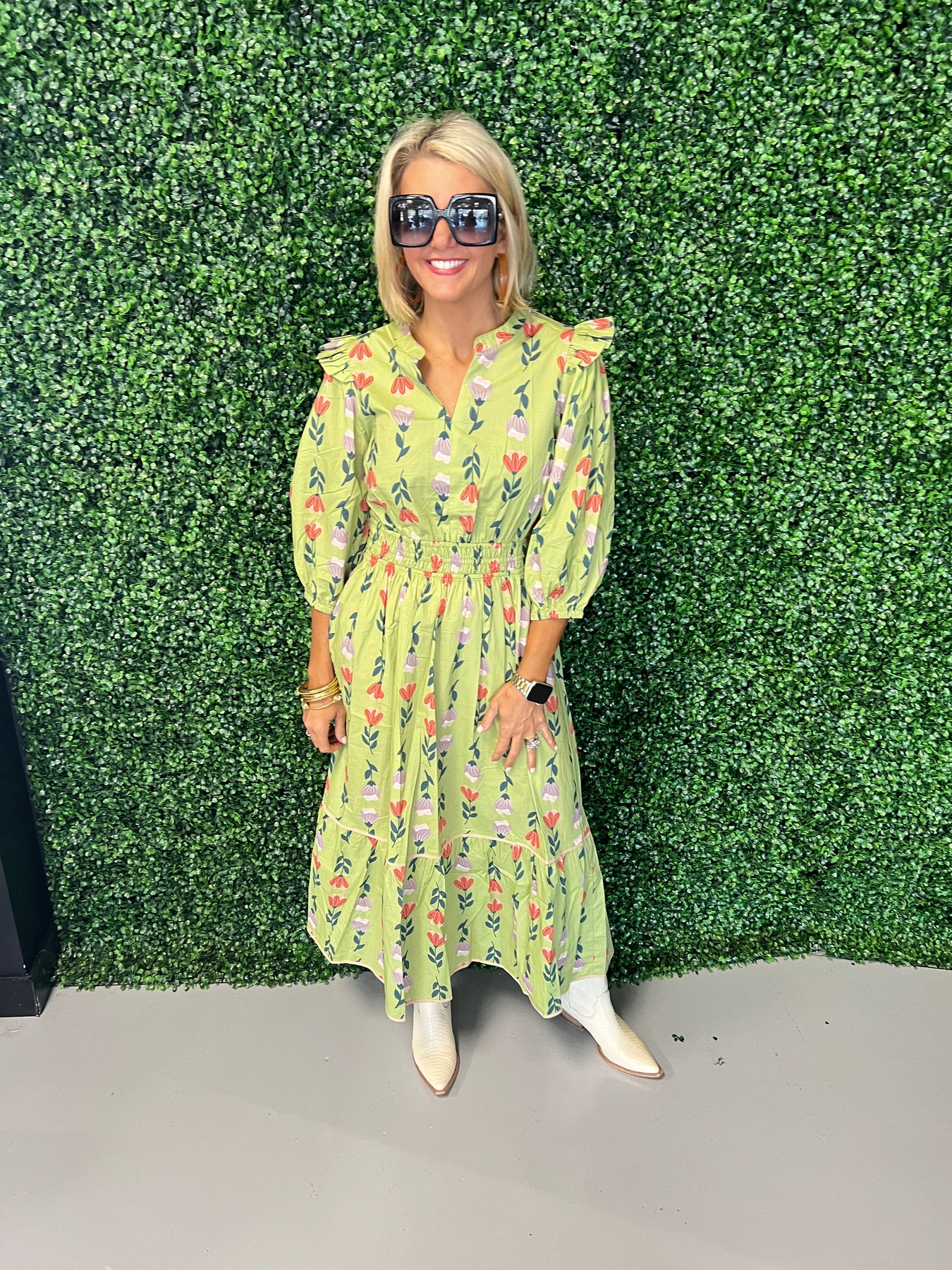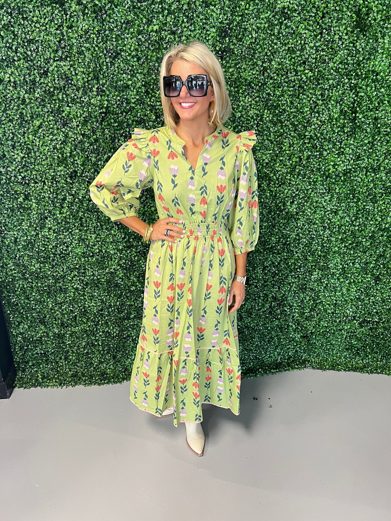 Sage Puff Sleeve Smocked Floral Midi Dress