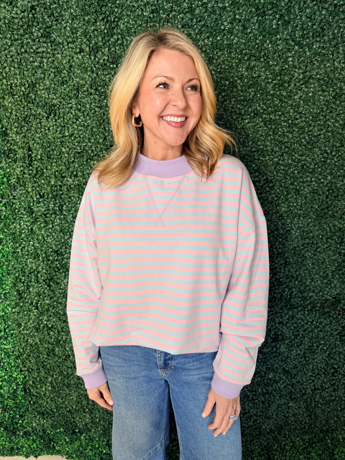 Elevate your loungewear game with this mock neck striped terry sweatshirt—the perfect blend of comfort and style. Crafted from soft, breathable terry fabric, it keeps you cozy whether you're working from home, running errands, or unwinding after a long day. The classic striped pattern adds visual interest, while the mock neck provides a polished, put-together look. Versatile enough to pair with joggers or jeans, this sweatshirt transitions seamlessly from casual to slightly dressed up. Invest in a piece that feels as good as it looks.