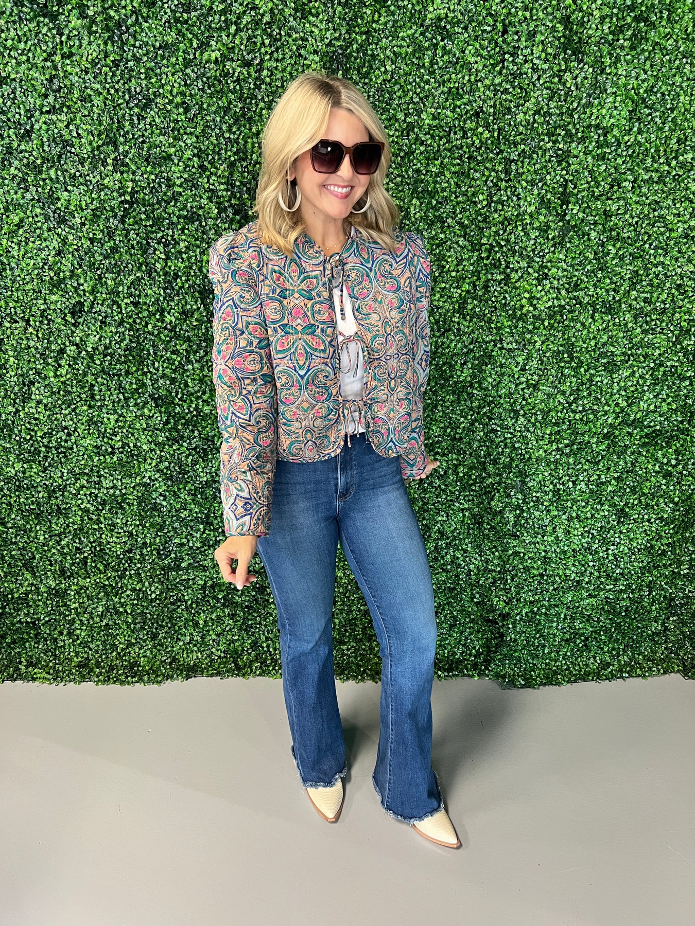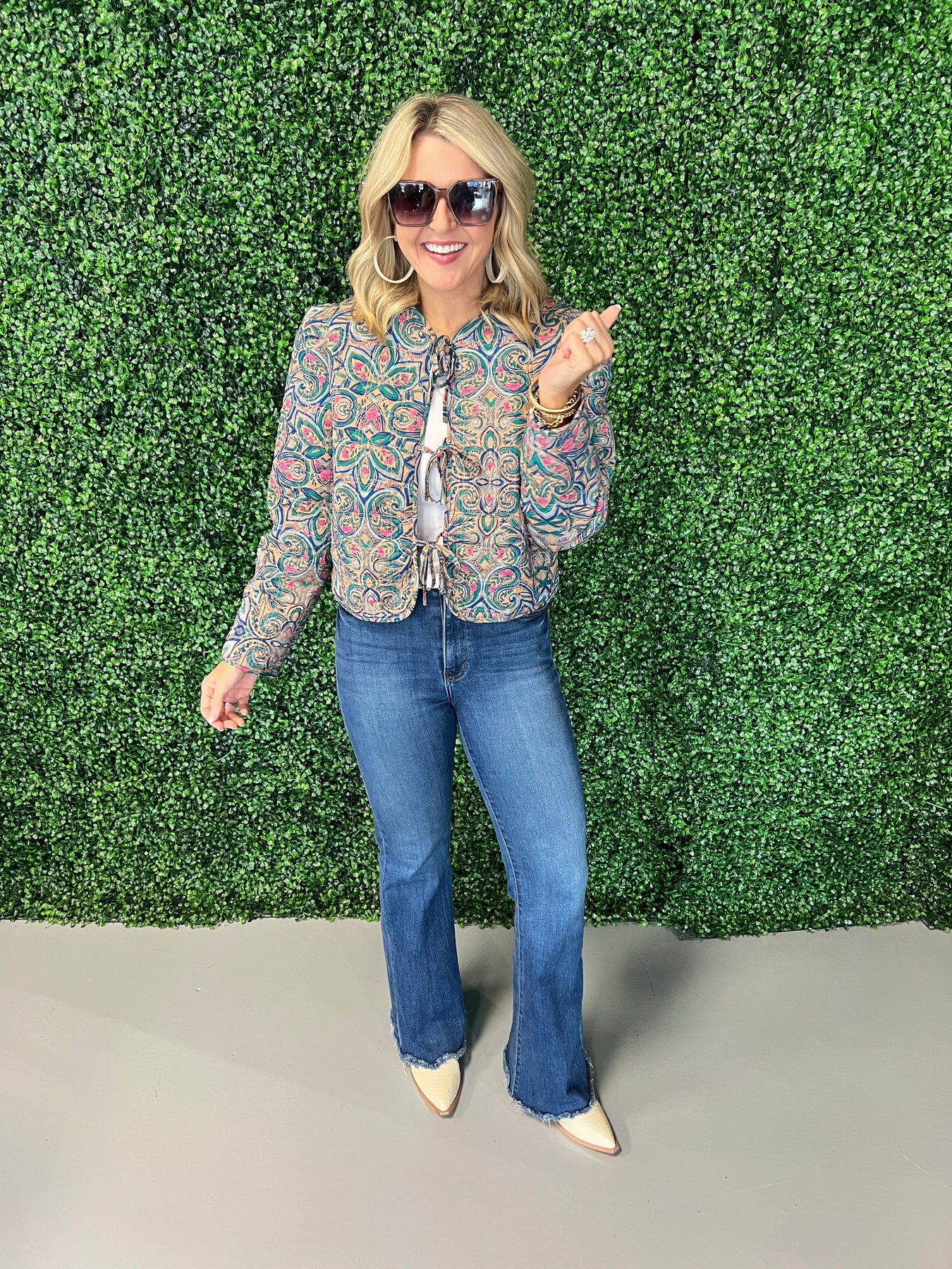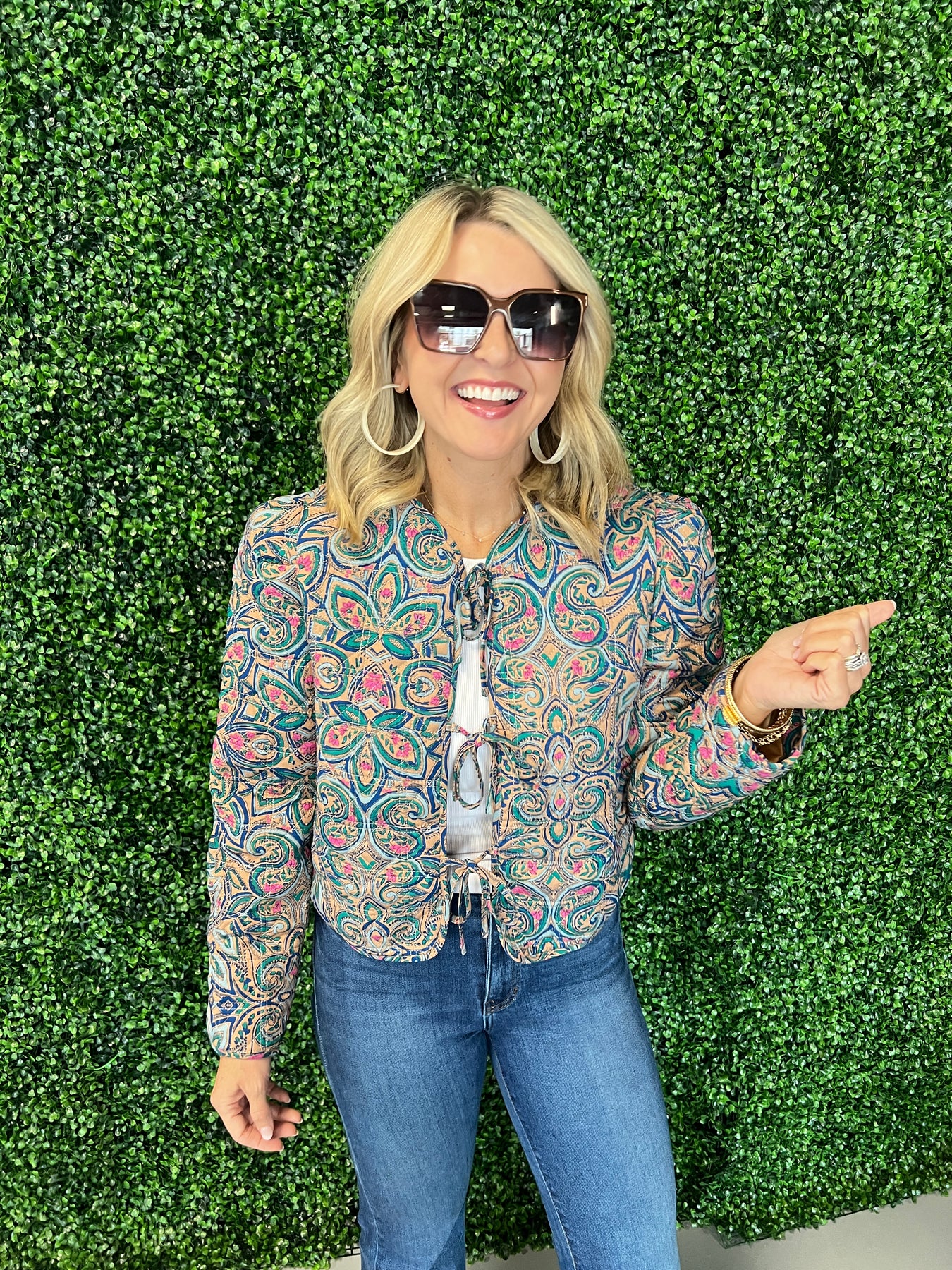 Elevate your style with this Quilted Print Jacket featuring a charming bow tie front. Its quilted design offers cozy warmth while the unique print adds a fashionable edge. Perfect for layering, this jacket combines comfort and elegance, making it an ideal choice for both casual outings and dressier occasions. Add a touch of sophistication to your wardrobe with this versatile piece.