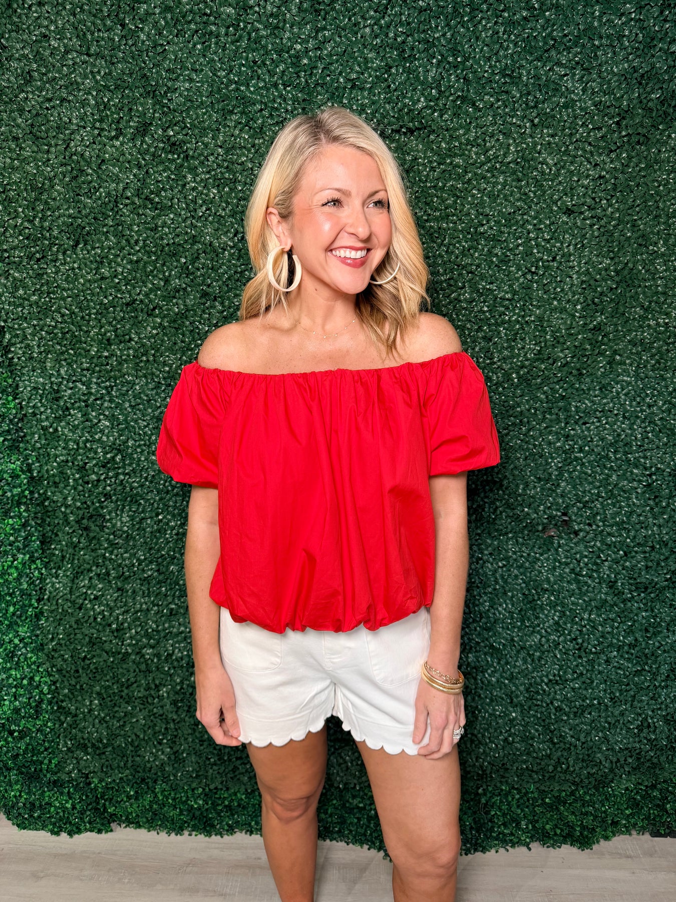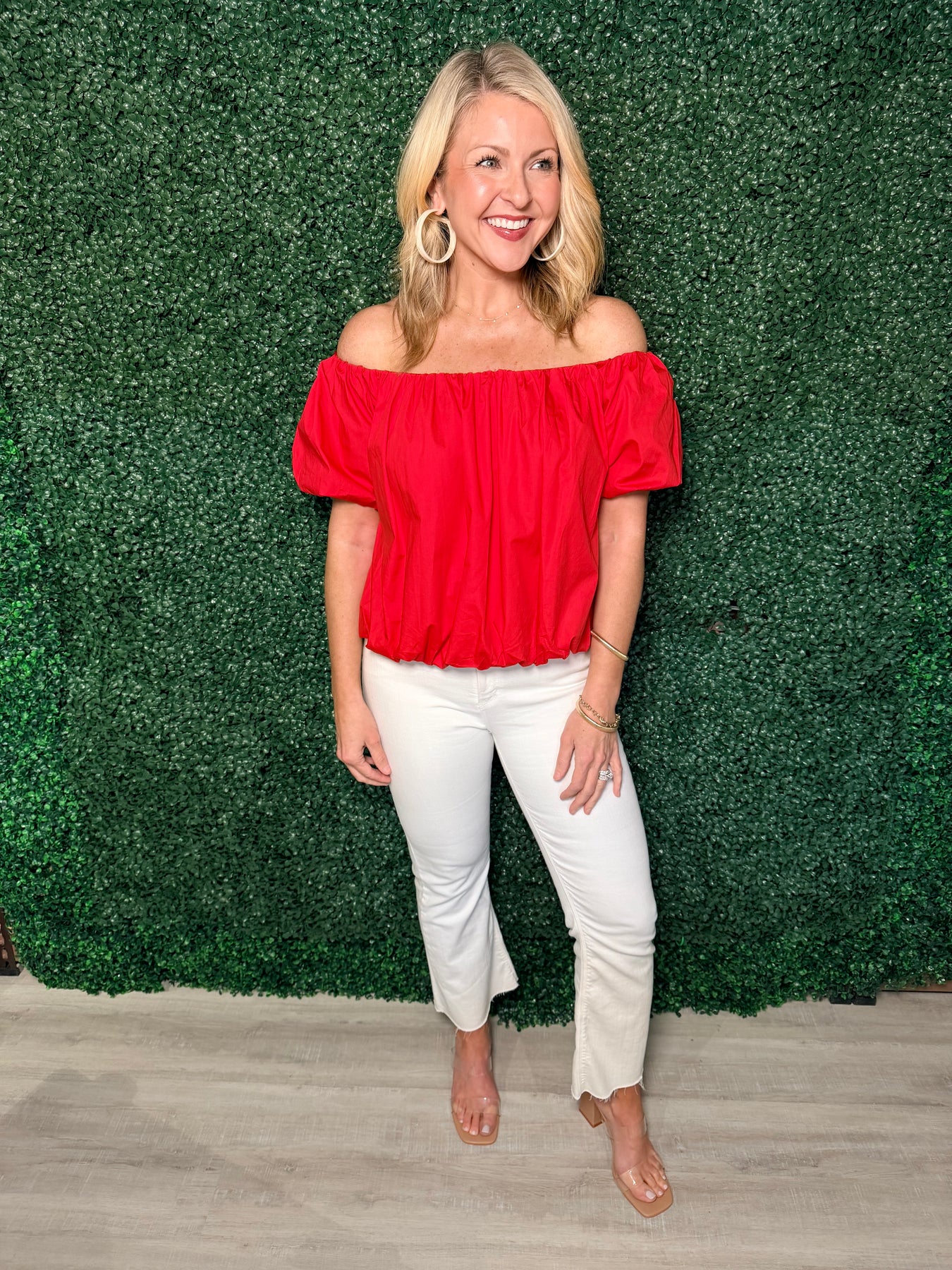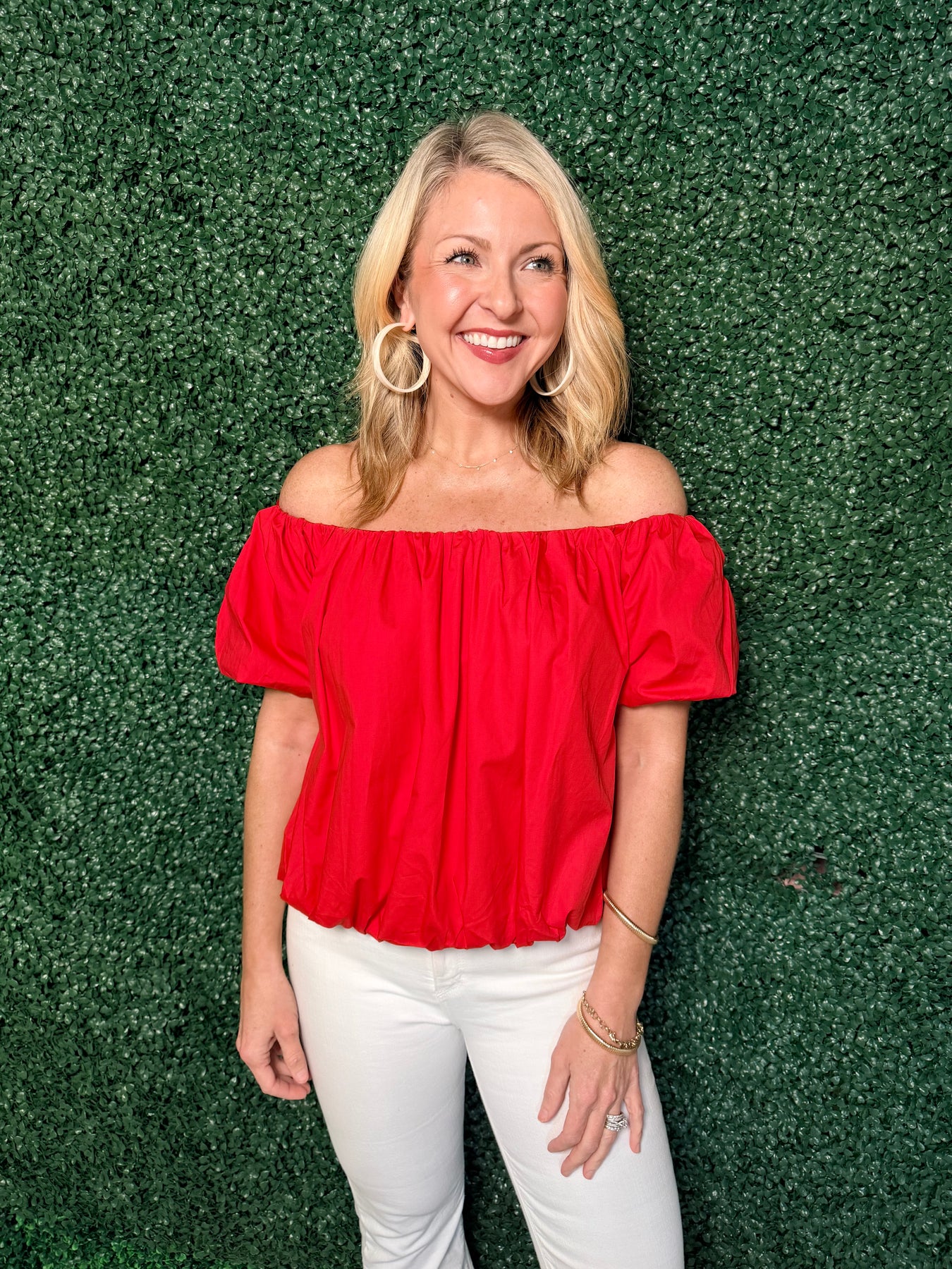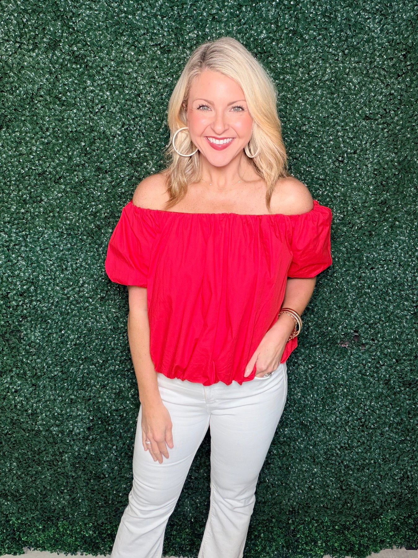 Embrace effortless elegance with this off-the-shoulder puff sleeve top, designed to celebrate your feminine style. The dramatic puff sleeves add romantic volume while the cinched bottom creates a flattering silhouette that defines your waist. Perfect for date nights, brunch outings, or any occasion where you want to feel confident and chic. The bardot neckline offers a modern twist on classic sophistication, making this versatile piece a must-have addition to your wardrobe.