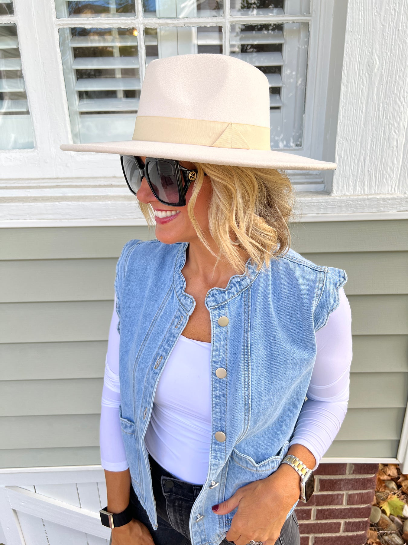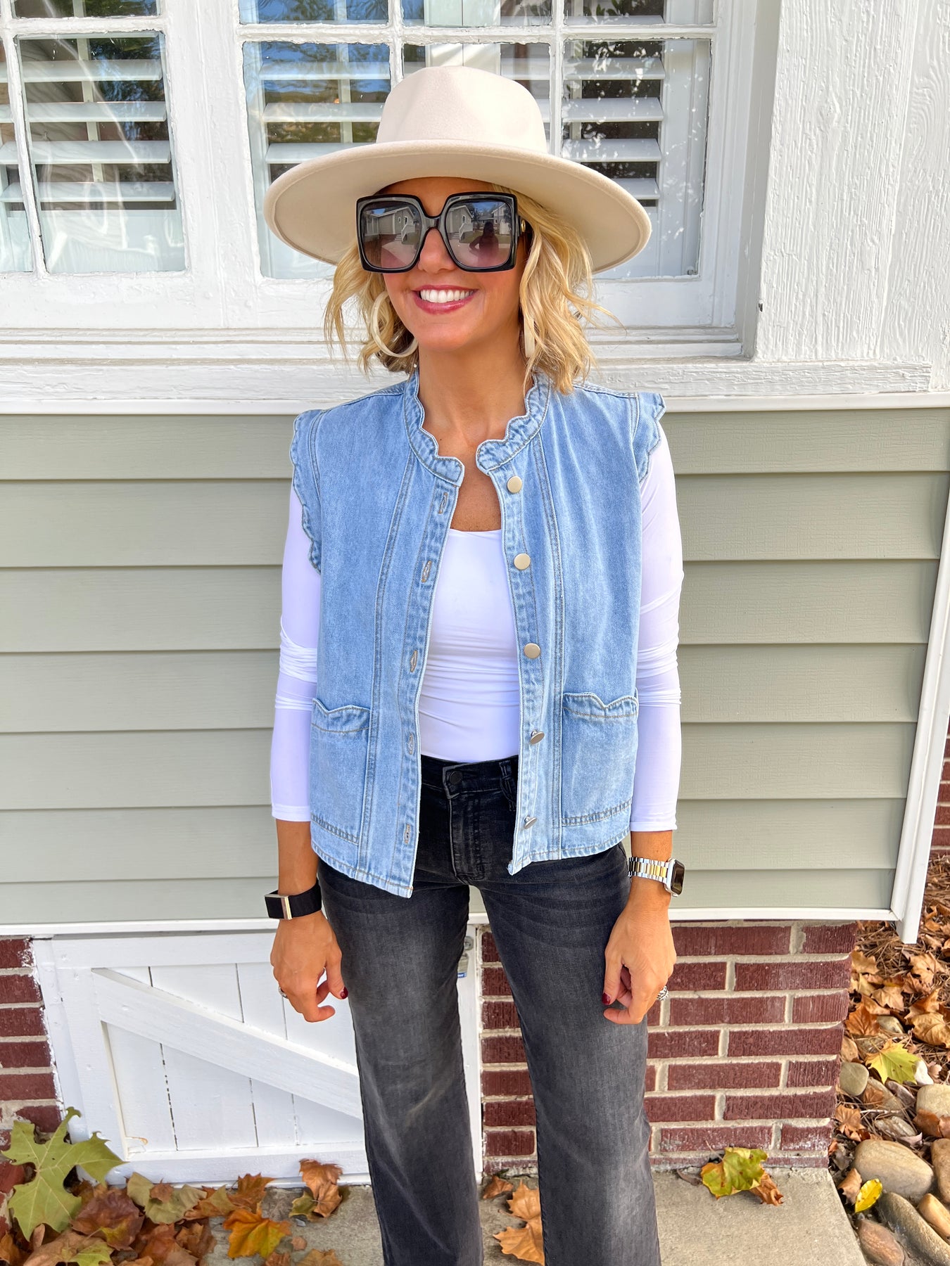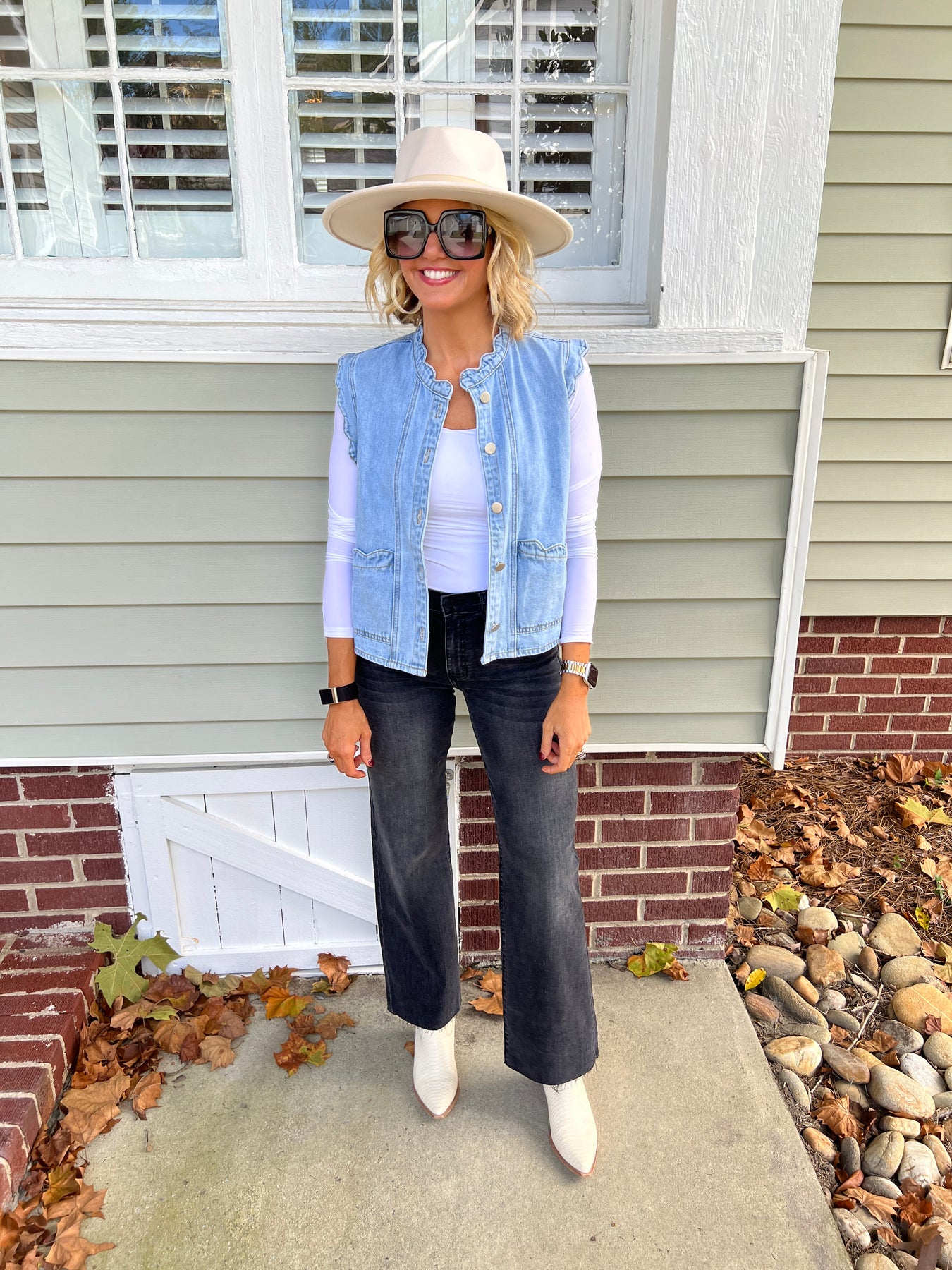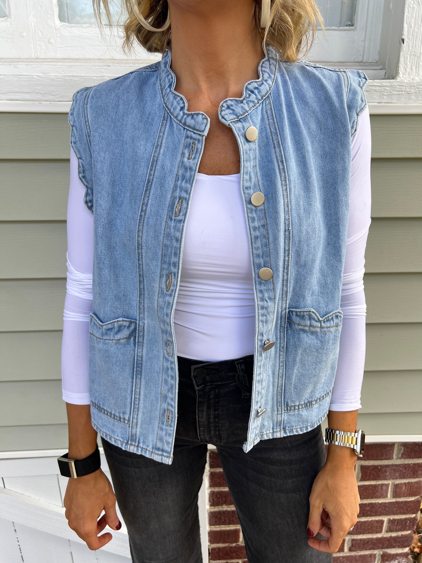 Elevate your style with the Scallop Edge Detailed Denim Crop Vest, designed to add a fresh, trendy twist to any outfit. Its unique scalloped hem delivers a feminine touch while the cropped cut keeps your look modern and versatile. Perfect for layering over tees or dresses, this vest offers both comfort and a statement-making edge to your wardrobe essentials.