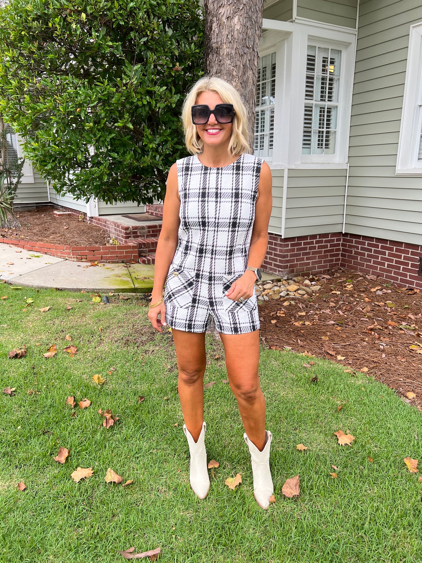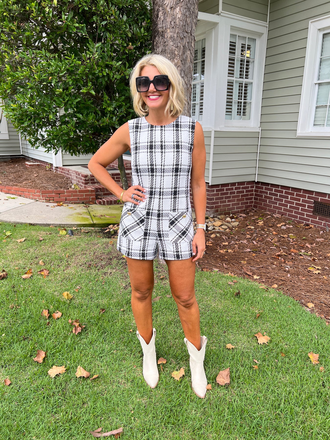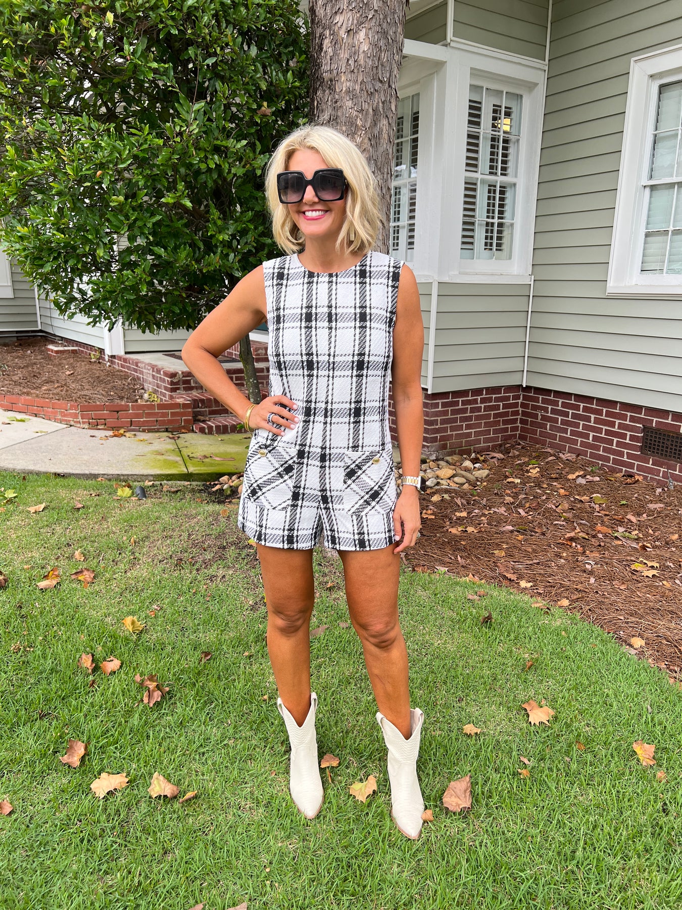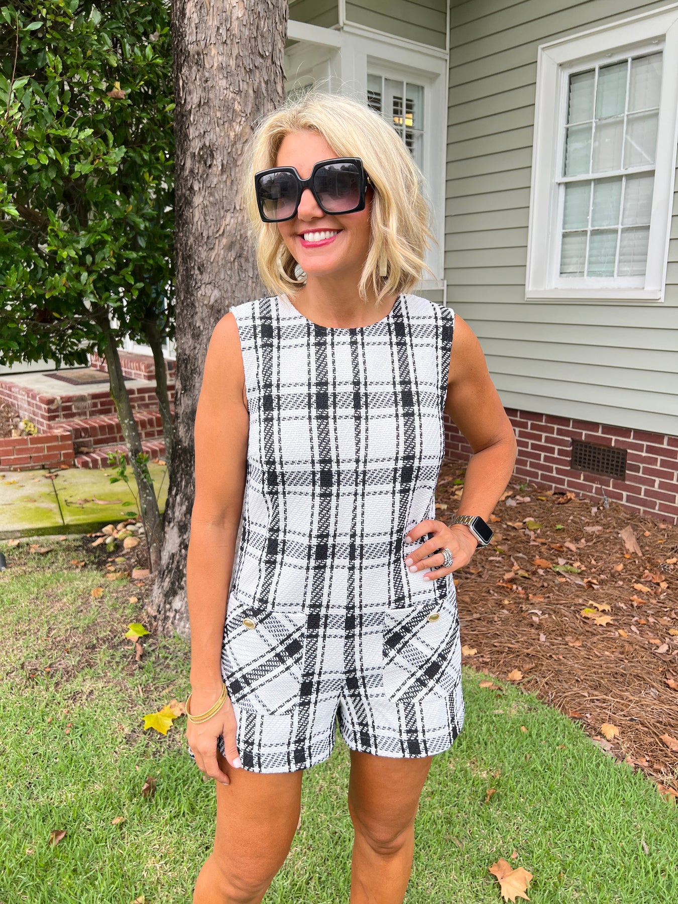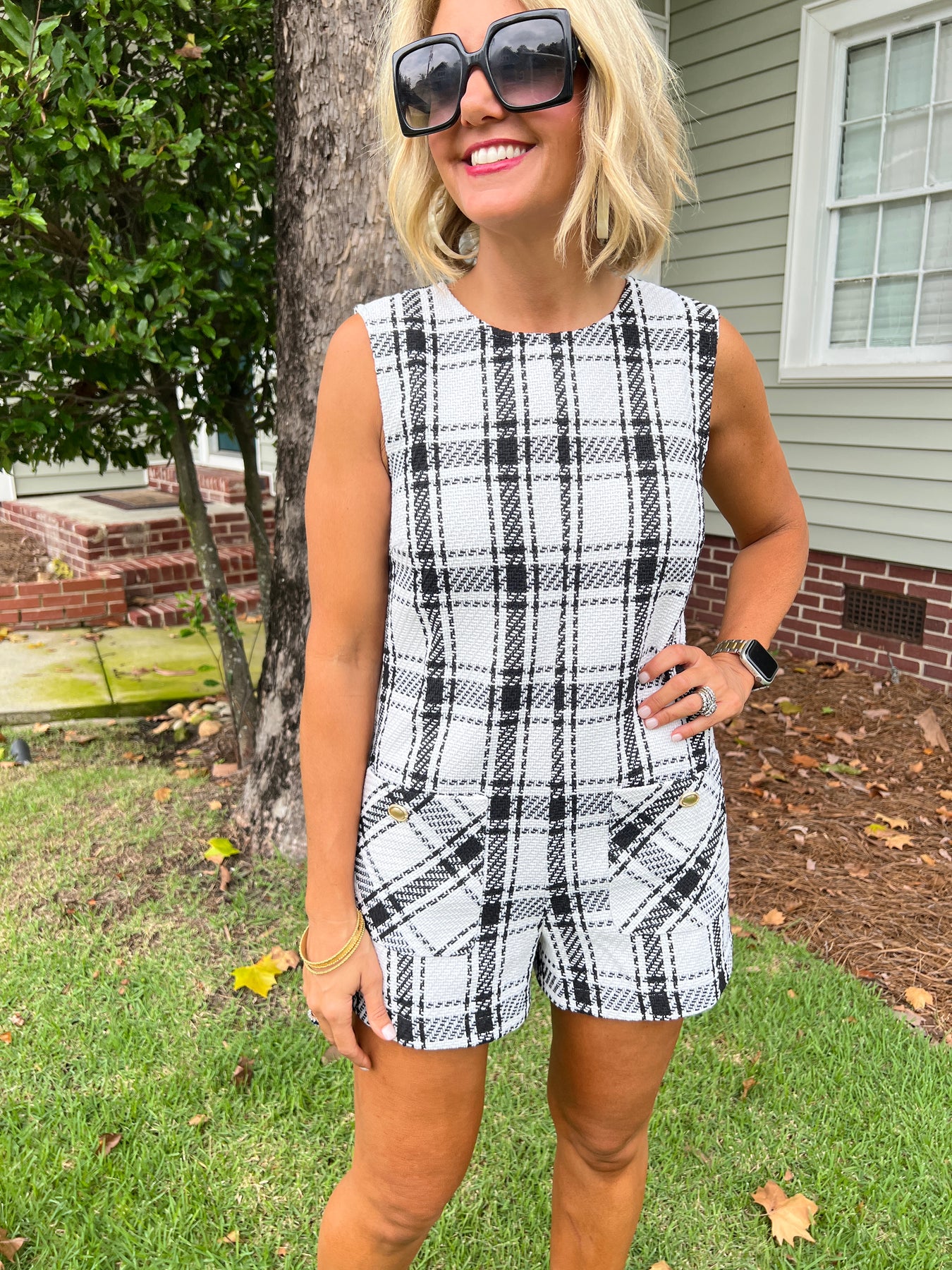 Elevate your wardrobe with this sleeveless round neck tweed romper featuring convenient pockets. Its timeless tweed fabric combines style and comfort, making it perfect for day-to-night wear. The tailored fit flatters your silhouette while pockets add practicality without sacrificing elegance. Ideal for occasions that demand both chic and ease in one versatile piece.