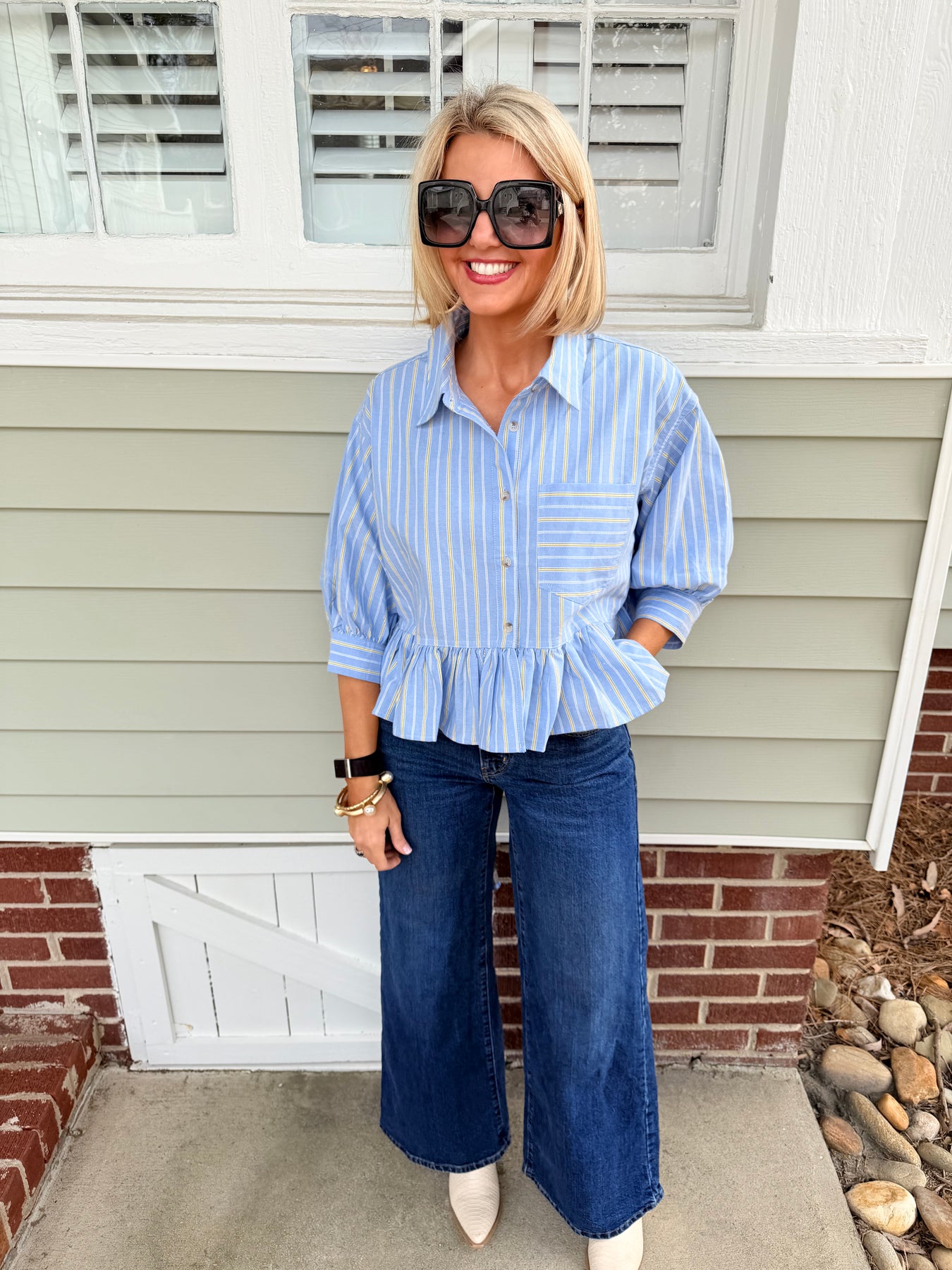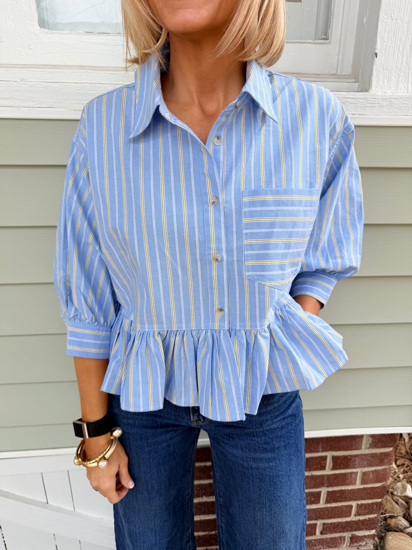 Striped Boxy Button Down Cropped Shirt W/ Ruffles