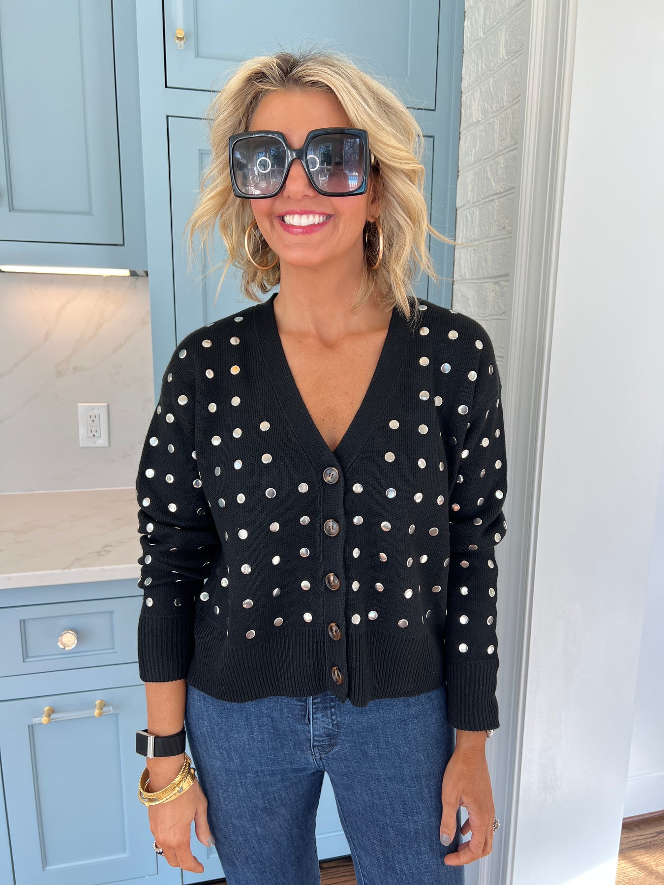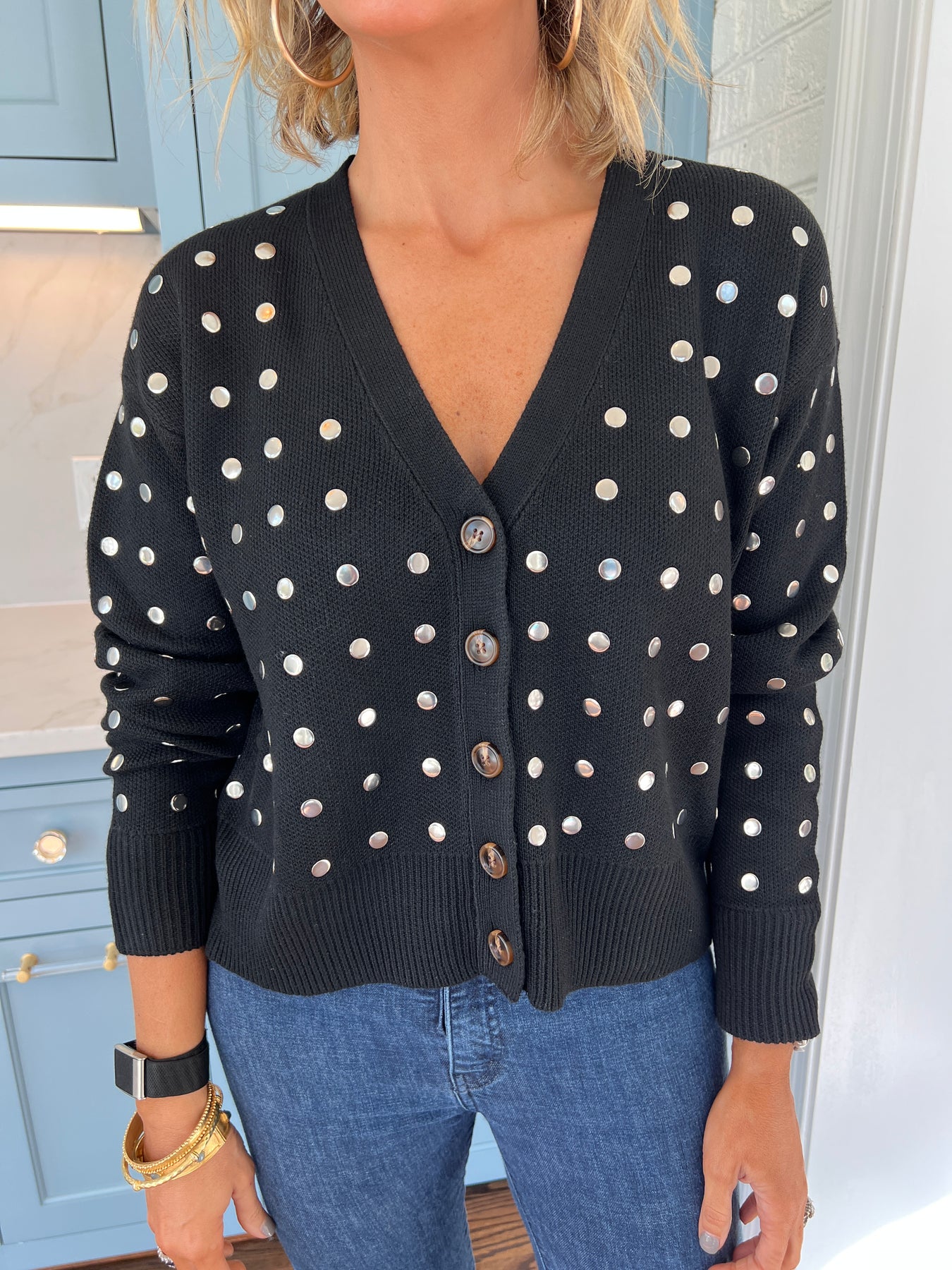 Elevate your wardrobe with this silver-studded cardigan sweater, blending edgy detail with cozy comfort. The shimmering studs add a striking touch to a classic silhouette, making it perfect for standout style in any season. Soft and versatile, this sweater pairs effortlessly with your favorite jeans or skirts for a polished, confident look.