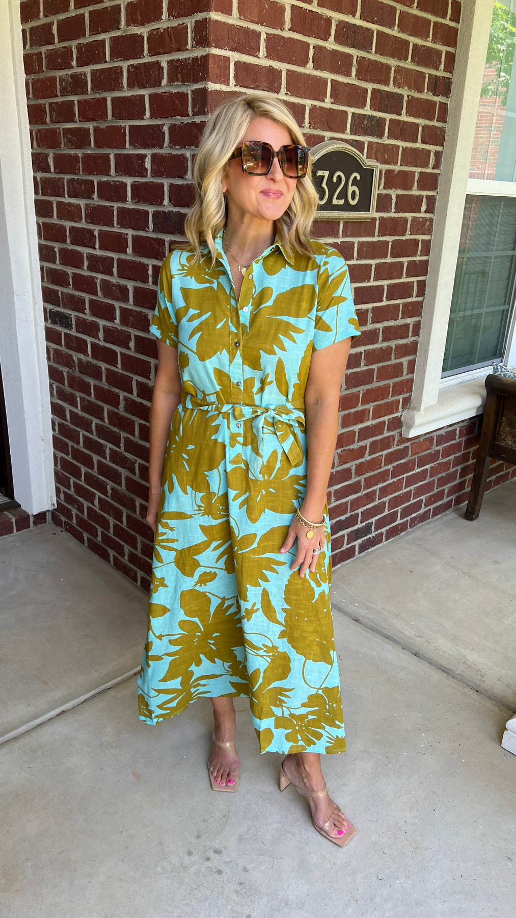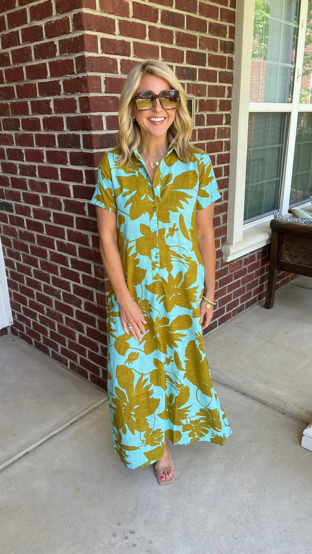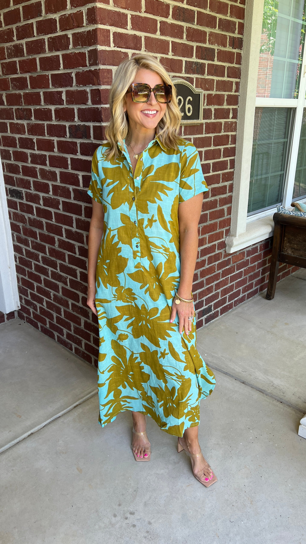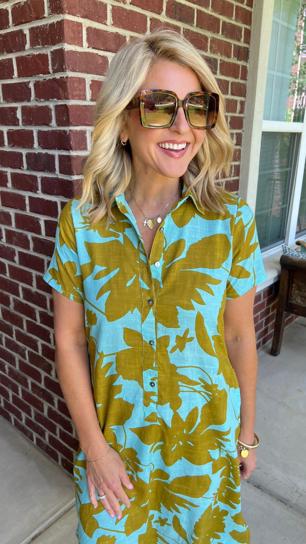 This stunning Turquoise & Olive Print Dress is sure to turn heads! The vibrant color combination and bold print make it a perfect addition to any wardrobe. Its lightweight fabric and flowy design provide comfort and style for any occasion. Elevate your outfit and make a statement with this eye-catching dress!