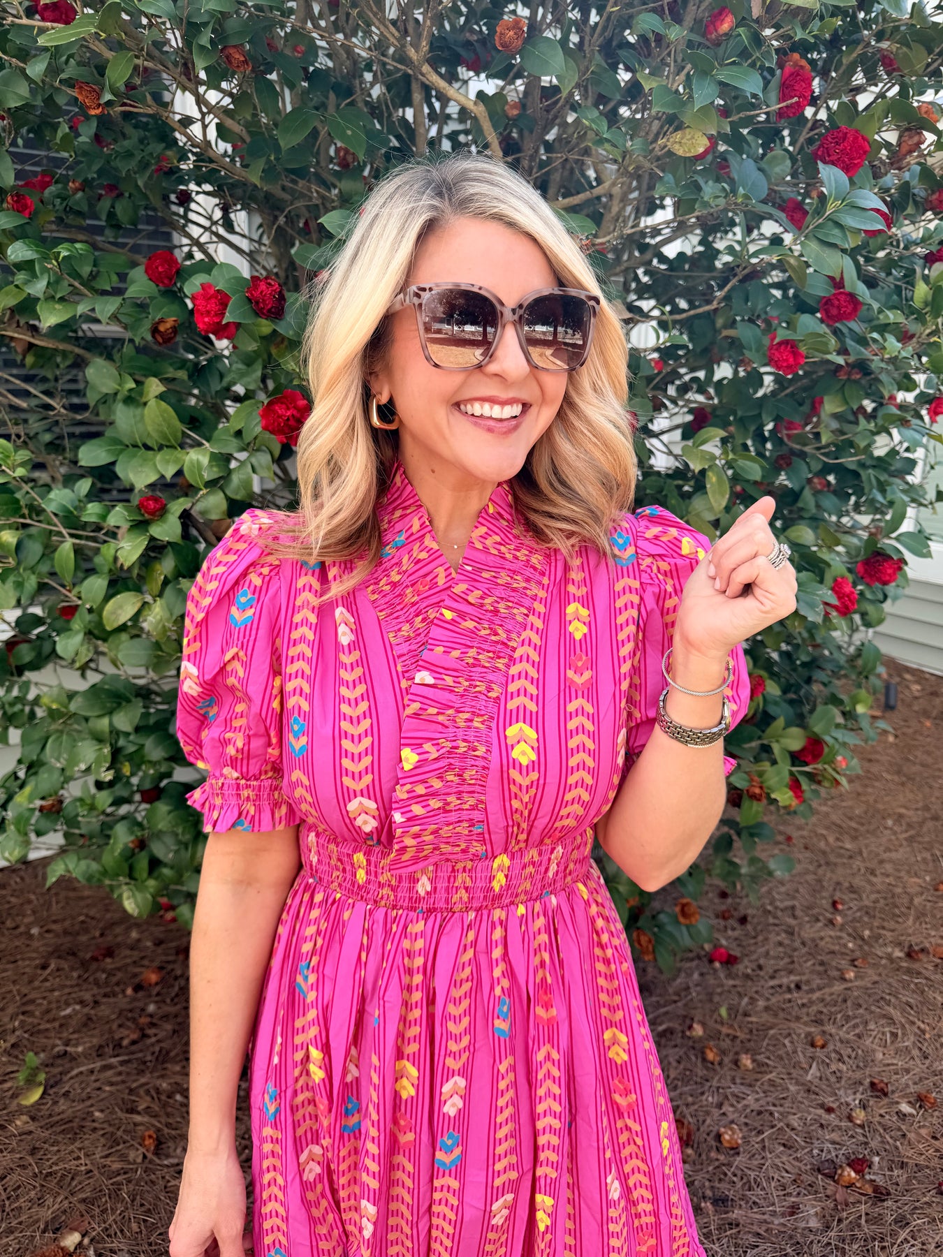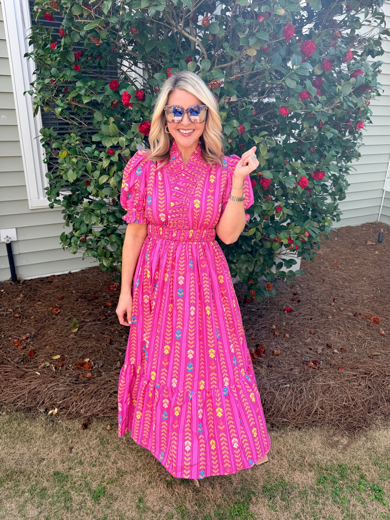 Elevate your wardrobe with this stunning midi dress that combines timeless elegance with modern flair. The intricate smocking detail creates a flattering silhouette while the vibrant ruffles add movement and personality to every step. Perfect for brunch dates, garden parties, or any occasion where you want to make a memorable impression. The midi length offers versatility—dress it up with heels or keep it casual with sneakers. This piece is designed to turn heads and boost your confidence with its eye-catching color and romantic details.