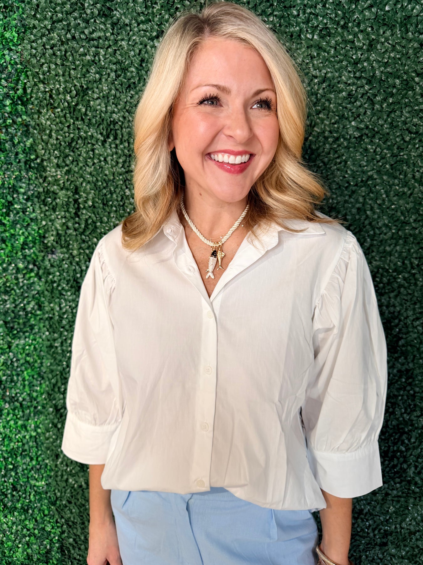 Elevate your everyday wardrobe with this crisp white button-down top, featuring distinctive half cuff sleeves that add a modern twist to a classic silhouette. The structured fabric maintains its shape throughout the day, while the versatile white hue pairs effortlessly with jeans, skirts, or tailored trousers. Perfect for layering or wearing solo, this piece transitions seamlessly from office to weekend. A timeless essential that works as hard as you do.